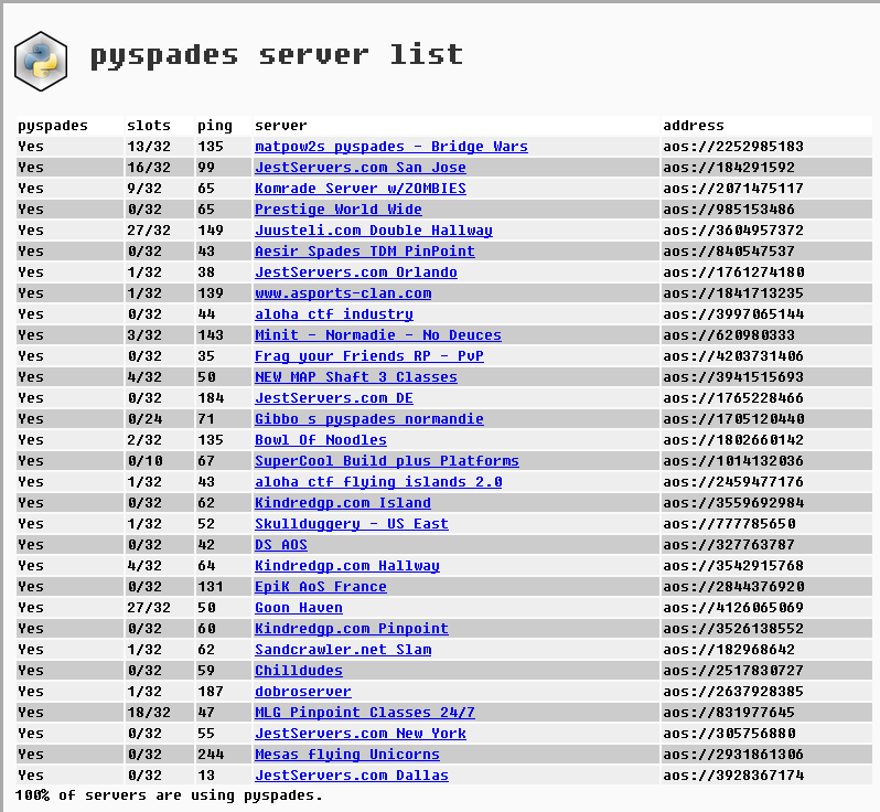 So I checked the pyspades server list this morning, and apparently, pyspades has reached complete world domination: http://mp2.dk/worlddomination.png I'm in a rush, so I don't have the time to make a milestone thread again, but you know who I would be thanking :) |
